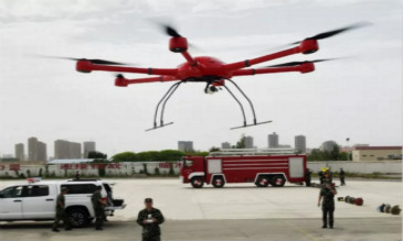 7月1日,在巴州公安消防支隊(duì)特勤中隊(duì)營(yíng)區(qū),消防人員正在測(cè)試消防無(wú)人機(jī)?! ∪藛T被困河中央,河水湍急、救援人員不能...